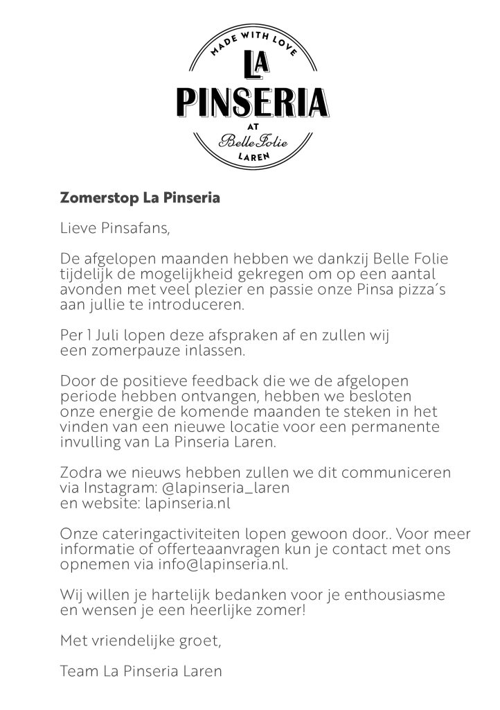 Door de positieve feedback die we de afgelopen periode hebben ontvangen, hebben we besloten onze energie de komende maanden te steken in het vinden van een nieuwe locatie voor een permanente invulling van La Pinseria Laren.